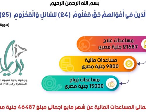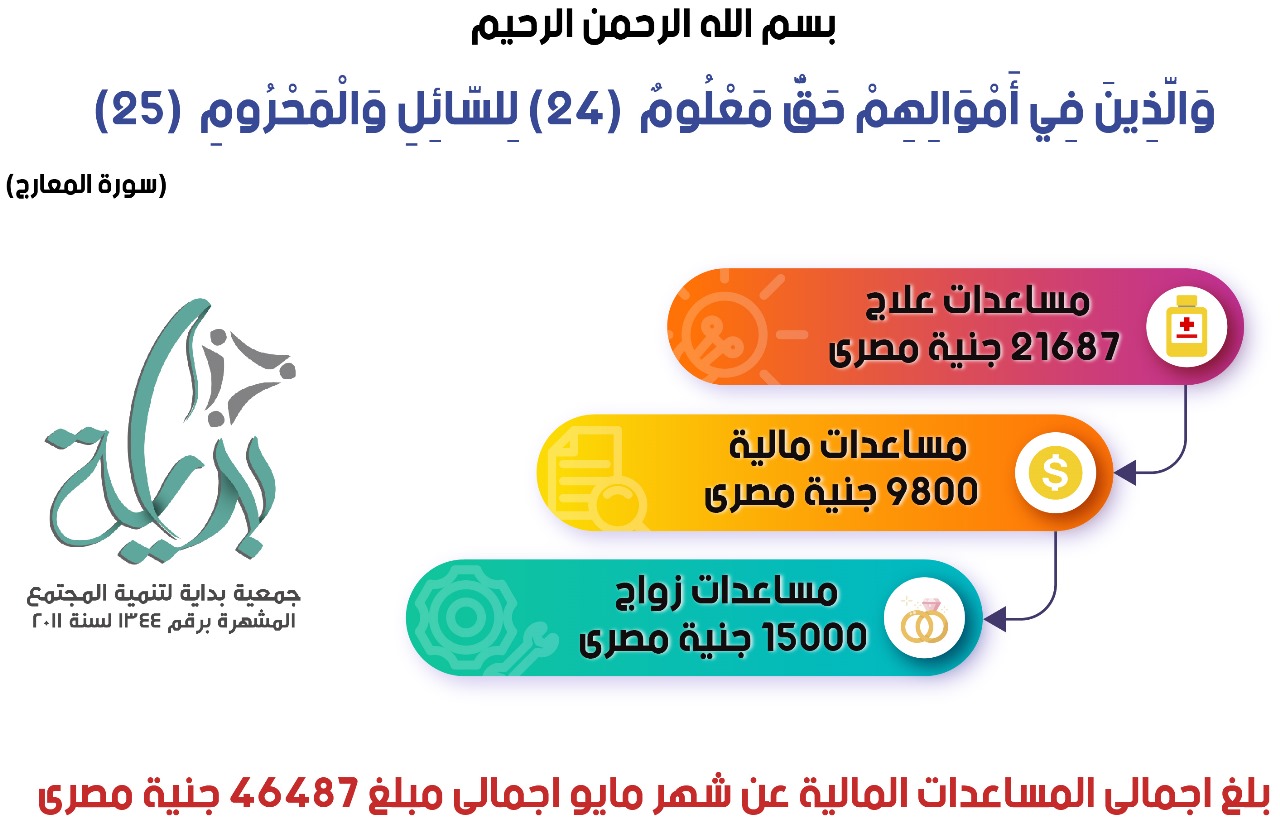 بفضل الله وتوفيقه قامت جمعية بداية لتنمية المجتمع  بتقديم المساعدات المالية  ومساعدات الزواج وعلاج المرضي من صرف روشتات علاج والمساعدة في تكاليف العمليات الجراحية وذلك لحالات الجمعية من الفقراء والمحتاجين بإجمالي مبلغ وقدره ( 35799) خمسة وثلاثون الف سبعمائه وتسعه وتسعون جنيها مصريا.
