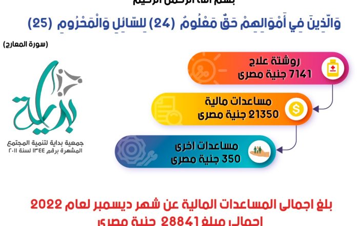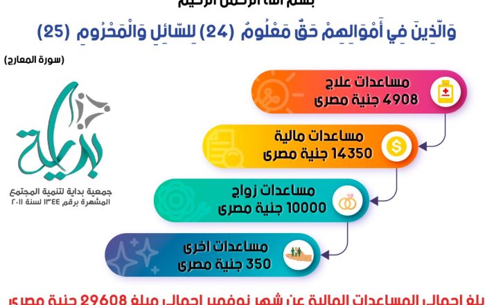 ايمانا من جمعيه بداية لتنمية المجتمع بأحقية كل فرد في المجتمع فى حياة سعيدة وآمنة تقوم الجمعيه ببذل كافه الجهود الممكنه لتوفير المساعدات الضروريه للحالات الأكثر احتياجاً كمساعدات زواج  ( الستر ) ومساعدات عينيه وعمليات جراحيه وصرف روشتات علاجيه وفك كرب غارمات بجانب دعم المستشفيات والكوادر الطبية خلال الازمة التى تمر بها الدوله – ازمه فيروس كورونا – و ما زالت مسيره العطاء مستمرة برغم قله الامكانيات والموارد والازمه الحاليه .