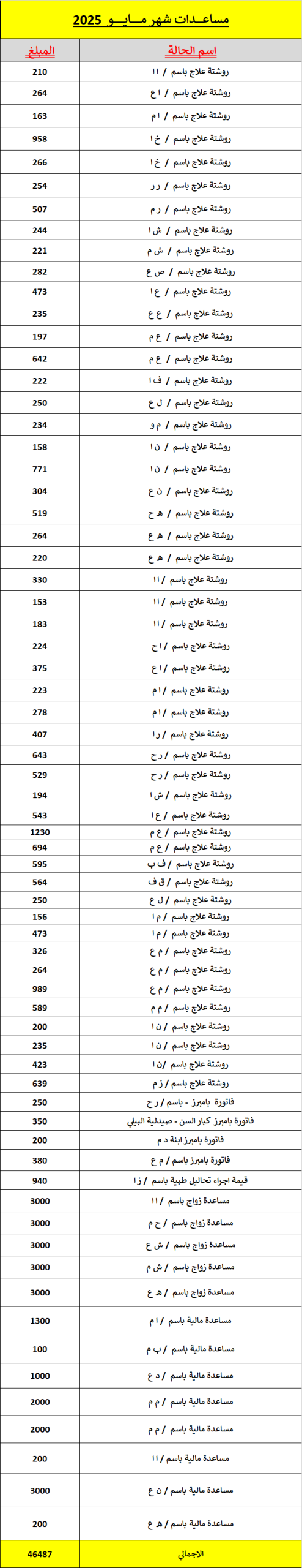 واليكم بيانات بالمساعدات التي قدمتها الجمعية لحالات جمعية بداية لتنمية المجتمع ( بداية الخير ) خلال شهر مايو 2025.